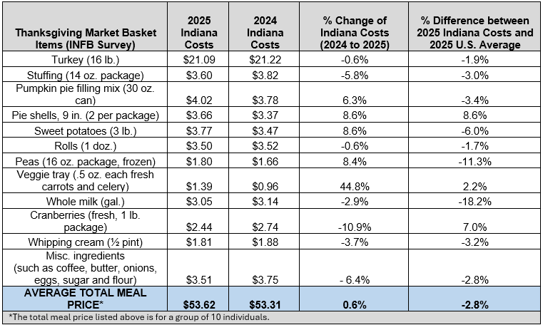 (Indianapolis) – Nov. 19, 2025 – Hoosiers gathering around the table for Thanksgiving dinner won’t see much change in the cost of their holiday meal. Indiana Farm Bureau’s annual Thanksgiving market basket survey shows Hoosiers are paying an average of $53.62 for Thanksgiving dinner for 10 people, or $5.36 per person – an increase of 0.6%, or 3 cents per person, from last year. From a national perspective, Indiana’s market basket price is approximately 3% lower, 16 cents less, than the U.S. average price of $55.18, or $5.81 per person.